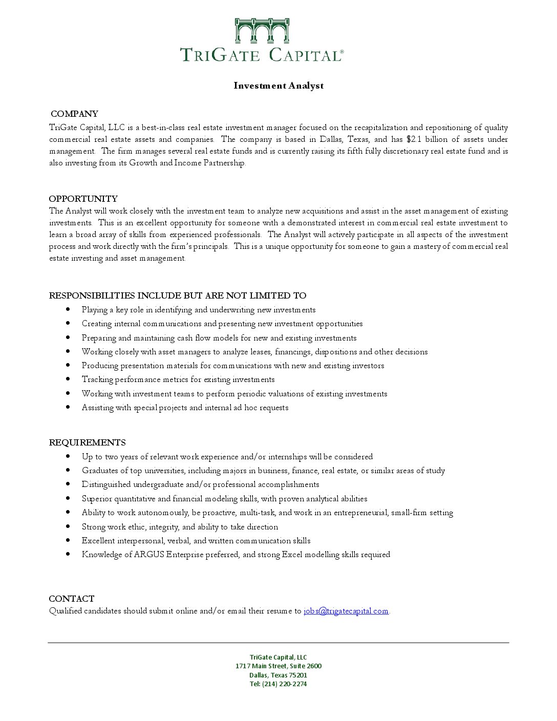 Qualified candidates should submit online and/or email their resume to jobs@trigatecapital.com.